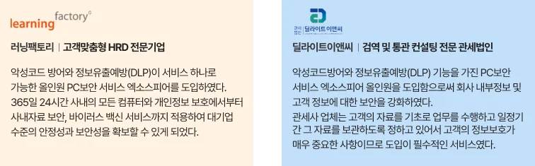 작년도 클라우드 바우처 이용지원 우수사례를 한 번 보실까요? ‘엑소스피어 PC보안 올인원 플랜’ 서비스를 이용하신 고객사들이 이렇게 보안 강화에 도움되었다고 합니다!