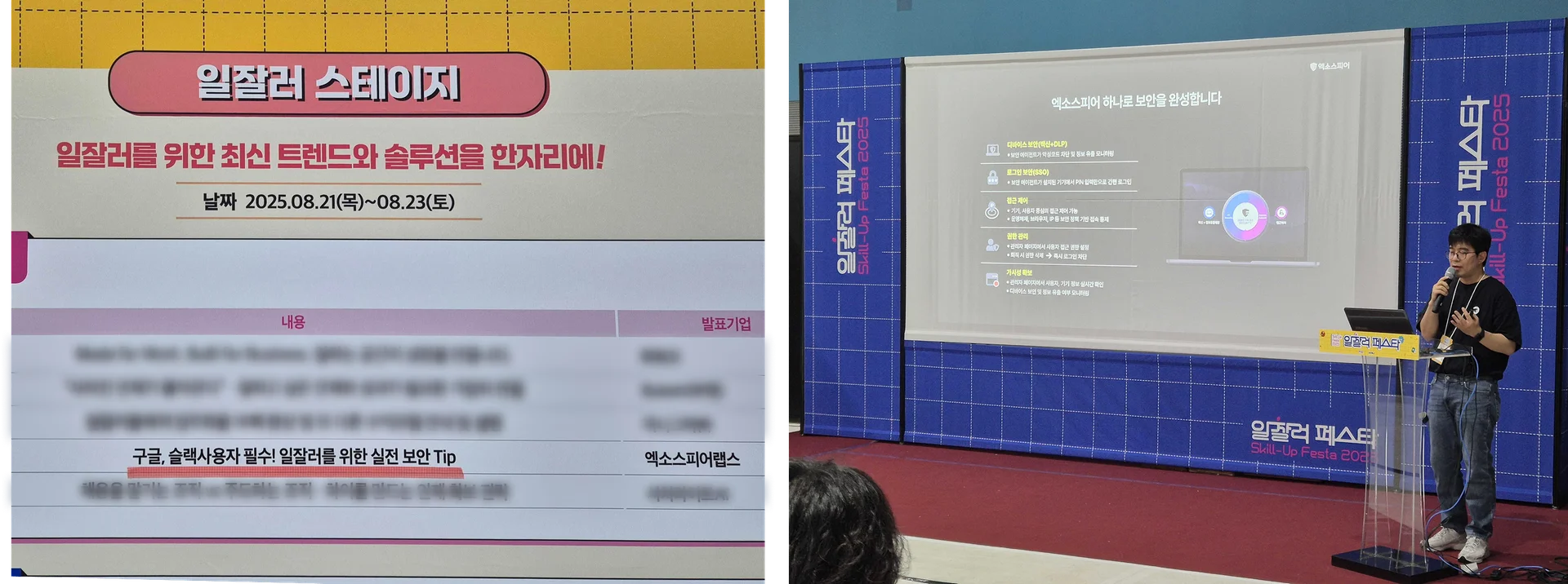 엑소스피어는 지난 8월 21일(목)부터 23일(토)까지 3일간, 서울 SETEC 전시장에서 열린 「2025 일잘러 페스타(Skill-Up Festa 2025)」에 참가했습니다. 일잘러 페스타는 인사·경영관리 담당자를 비롯해 다양한 업계 관계자들이 한자리에 모여 업무 생산성을 높이기 위한 교류의 장으로 마련된 국내 유일의 비즈니스 성장 플랫폼 전시회입니다. 올해가 첫 개최였던 만큼 현장의 열기도 정말 뜨거웠는데요, 엑소스피어는 이 자리에서 고객님들과 직접 만나 ‘올인원 PC보안’ 및 ‘제로트러스트 보안’ 제품을 시연해드리고 다양한 보안 고민에 대한 이야기를 나누는 시간을 가졌습니다!
