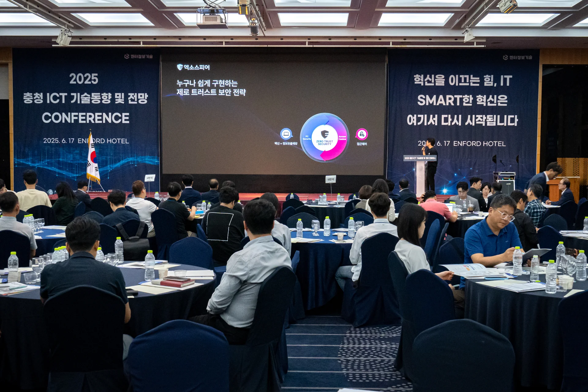 지난 6월 17일, 청주 엔포드호텔에서 ‘2025 충청 ICT 기술동향 및 전망 컨퍼런스’가 개최되었습니다. 이번 행사에는 충청 지역 IT 전문가와 기업 전산 담당자들이 모여 ICT 산업의 최신 기술 트렌드와 현실적인 협력 방안을 함께 고민하는 시간이 마련되었는데요. 엑소스피어도 컨퍼런스에 참여해 ‘엔드포인트 중심의 제로트러스트 보안 전략’을 주제로 발표하고, 부스를 운영하며 엑소스피어 제품들을 자세히 소개하는 시간을 가졌습니다.