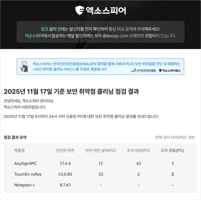 관리자 대상 혜택으로는 전사 취약 프로그램 상태를 한 눈에 확인할 수 있는 자동 리포트를 매일 이메일로 제공합니다. 리포트에는 점검 결과 요약과 제품별 점검 결과 상세내역 등이 포함되며, 위 이미지로 리포트 일부 내용을 확인해보실 수 있습니다. 취약점 조치 결과는 실시간으로 반영되어 관리 효율성이 향상됩니다!