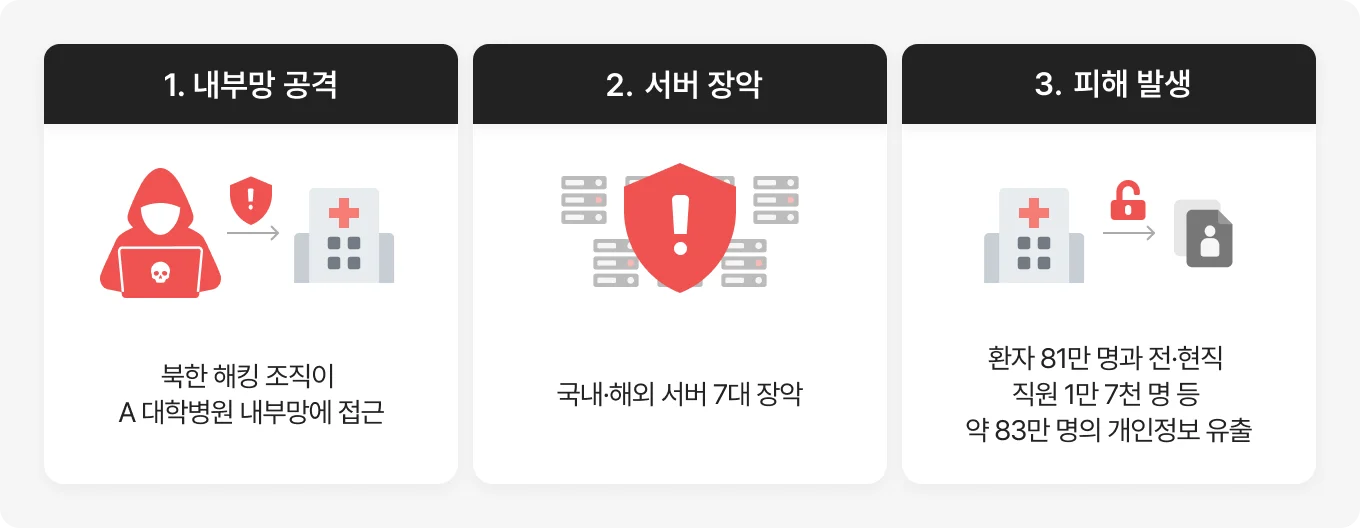 2021년 5월부터 6월 사이, A 대학병원 내부망이 사이버 공격을 받아 약 83만 명 이상의 환자 및 전‧현직 직원 개인정보가 유출된 것으로 확인되었습니다. 한국 경찰청 국가수사본부는 이 사건이 북한 해킹 조직의 소행임을 확인했으며, 공격자는 내부망의 여러 서버에 접근하여 환자 및 직원 정보를 탈취한 것으로 조사되었습니다. 유출된 정보에는 환자와 직원의 개인 정보와 일부 진료 관련 데이터가 포함된 것으로 알려졌습니다. 또한, 다량의 의료정보(환자의 개인정보 등)가 유출된 사안에 대해 교육부와 국가정보원이 합동으로 조사를 실시한 후 보안취약점 개선을 요구했음에도 이를 3개월 여 방치했던 것으로 드러났습니다. 해당 사고는 국내 주요 의료기관의 사이버 보안 취약성을 드러내며, 의료업 전반에 보안 체계 강화와 보안 거버넌스 점검의 필요성을 부각시키는 계기가 되었습니다.