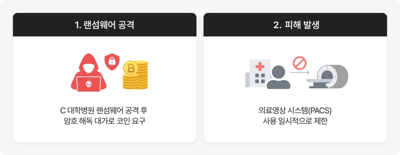 2026년 1월, C 대학병원이 랜섬웨어 공격을 받아 의료영상 시스템(PACS, MRI·CT 등)의 사용이 일시적으로 제한되었습니다. 병원 측은 공격을 인지한 이후 해당 서버 네트워크를 분리하고 외부 접속을 차단하였으며, 응급 서버를 개설해 진료에 차질이 없도록 조치했습니다. 공격자는 시스템 복구를 위해 암호 해독 대가로 코인을 요구한 것으로 알려졌습니다. 이후 병원은 의료영상 시스템 복구를 완료했으며, 보안 취약점을 재점검하고 내부 직원 보안 교육을 강화해 동일 사안이 재발하지 않도록 노력하겠다고 발표했습니다. 해당 사고는 대학병원의 전산망이 랜섬웨어 공격의 표적이 될 수 있음을 보여주며, 신속한 대응과 보안 체계 강화의 필요성을 부각시키는 계기가 되었습니다.
