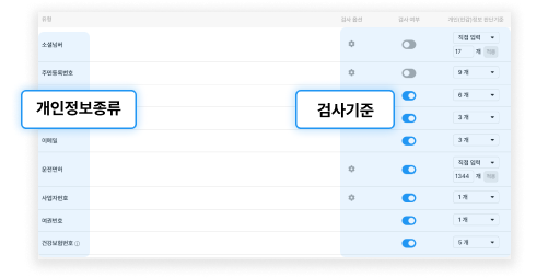 주민등록번호, 여권번호, 운전면허번호, 계좌번호, 이메일 주소 등 사내에서 탐지를 원하는 정보와 탐지 기준을 회사에서 원하는 대로 정할 수 있습니다.